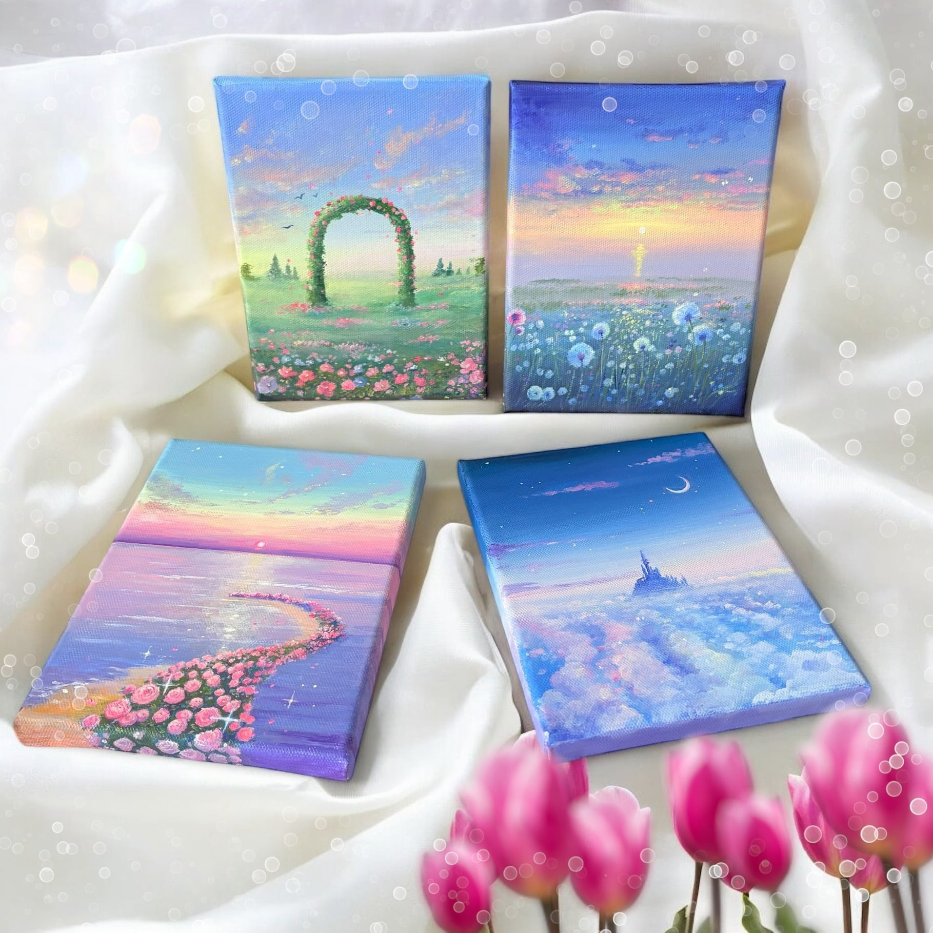 ふわふわとした雲の上に佇む城を描いた、幻想的なアート作品「Castle on clouds」˚✧₊⁎ この作品は、心を軽やかにするような美しい風景が広がり、見る人の想像力をかき立てます。 雲のふわふわ感は独自の技術で何層にも分けて描きました。お手にとって頂ければその柔らかさが分かるはずです・:*+. お部屋のインテリアとして、または特別な方への贈り物としてもおすすめです♡ この作品を通じて、美しい夢のひとときをお楽しみいただけます。 ◆作品詳細◆ ✴︎サイズ: 14cm × 18cm ✴︎使用絵の具: アクリル絵の具・アクリルガッシュ ✴︎仕上げ: サテンバーニッシュ(半艶仕上用保護ニス) ✴︎付属品: なし ✴︎壁掛け用フックなし、押しピンを木枠にひっかけて飾れます。 ✴︎著作権: 放棄しておりませんので、転売、転載、自作発言はご遠慮ください(裏面か側面に作者のサインあり)。 ◆SNS◆ 当ショップの作品はSNSにて作成動画を公開中、または公開予定のものがあります。予めご了承くださいませ。 動画のご視聴は… ✴︎YouTube⇨ Meiko's Art Room ✴︎Instagram⇨ mei_studio5 ◆注意事項及びキャンセル◆ ✴︎絵の具での原画のため、一部凹凸があります。 ✴︎一点ものにつきイメージと違う等の理由での返品は不可でお願いします。気になる箇所がある際はご購入前にメッセージにてご確認くださいませ。 ✴︎当ページの画像は、角度や日光によって実物と若干の色味の違いがあるかもしれません。 ◆ラッピングについて◆ 絵画の原画、その他絵の具で直接描いた作品(オーナメントやコースターなど)は、追加料金なしでラッピングをいたします。※国内発送のみ ラッピングの例は画像をご確認ください。 ラッピングの種類や色の選択はお受けできません。 ラッピング用の箱はつかない場合があります。お送りする際の外箱は伝票を貼るのでプレゼントとしてお使いはできません。 ◆発送について◆ ✴︎5000円以下の作品はクリックポスト、5000円以上の作品はコンパクト便や宅急便にて発送します。 ✴︎絵を傷つけないよう保護紙や緩衝材に包んでお送りいたします。 ✴︎原画を複数点同時にご購入の際は、一度に発送できない場合があります(大きさによります)。 *・゜゚・*:.。..。.:*・'・*:.。. .。.:*・゜゚・* 上記以外でご質問がある方はお気軽にメッセージくださいませ♪ この「Castle on clouds」が、あなたの大切な空間に夢と癒しをもたらすことを心より願っております。お届けできる日を楽しみにしております。 検索ワード アクリル画/アクリル絵の具/アート/インテリア/癒し/幻想絵画/雲の上の城/贈り物/おしゃれ空間/ギフト/新生活/新築祝い