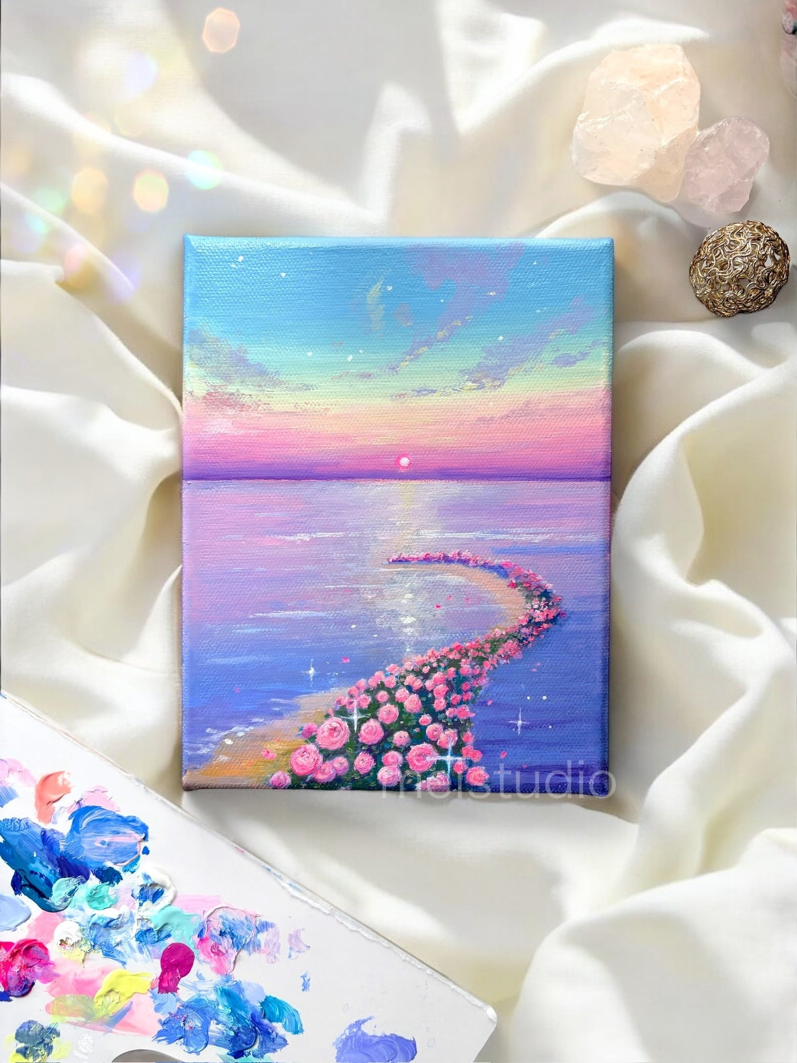 商品名:Rose sunset 絵画/インテリアアート おかげさまでInstagramにて再生回数11万回を突破しました⭐︎ 夕焼けに染まる海辺を優雅に彩る美しいバラの花々˚✧₊海風にのって甘い花の香りが漂ってくるかのようなキャンバスアート。心が和むこの作品は、花と夢のような景色を愛するすべての方にぴったりです˚✧₊⁎ 部屋やオフィス、カフェなどのお気に入りの空間を、華やかに演出してくれます˚✧₊⁎「Rose sunset」を通じて、ゆったりとした時間を楽しんでみませんか? ◆作品詳細◆ ✴︎サイズ: 14cm × 18cm ✴︎使用絵の具: アクリル絵の具・アクリルガッシュ ✴︎仕上げ: サテンバーニッシュ(半艶仕上用保護ニス) ✴︎付属品: なし ✴︎壁掛け用フックなし 裏の木枠にひっかけて壁掛け可能です。 ✴︎著作権: 放棄しておりませんので転売、転載、自作発言はご遠慮ください(作者のサインあり)。 ◆SNS◆ 当ショップの作品はSNSにて作成動画を公開中、または公開予定のものがあります。予めご了承くださいませ。 動画のご視聴は… ✴︎YouTube⇨ Meiko's Art Room ✴︎Instagram⇨ mei_studio5 ◆注意事項及びキャンセル◆ ✴︎絵の具での原画のため、一部凹凸があります。 ✴︎一点ものにつきイメージと違う等の理由での返品は不可でお願いします。気になる箇所がある際はご購入前にメッセージにてご確認くださいませ。 ✴︎当ページの画像は、角度や日光によって実物と若干の色味の違いがあるかもしれません。 ◆ラッピングについて◆ 絵画の原画、その他絵の具で直接描いた作品(オーナメントやコースターなど)は、追加料金なしでラッピングをいたします。※国内発送のみ ラッピングの例は画像をご確認ください。 ラッピングの種類や色の選択はお受けできません。 ラッピング用の箱はつかない場合があります。お送りする際の外箱は伝票を貼るのでプレゼントとしてお使いはできません。 ◆発送について◆ ✴︎5000円以下の作品はクリックポスト、5000円以上の作品はコンパクト便や宅急便にて発送します。 ✴︎絵を傷つけないよう保護紙や緩衝材に包んでお送りいたします。 ✴︎原画を複数点同時にご購入の際は、一度に発送できない場合があります(大きさによります)。 *・゜゚・*:.。..。.:*・'・*:.。. .。.:*・゜゚・* 上記以外でご質問がある方はお気軽にメッセージくださいませ♪ この「Rose sunset」が、あなたの日常に美しい彩りをもたらしますように。お届けできる日を心待ちにしております。 検索ワード アクリル画/アクリル絵の具/アート/インテリア/花/夕焼け/おしゃれ空間/新居/新築祝い/贈り物