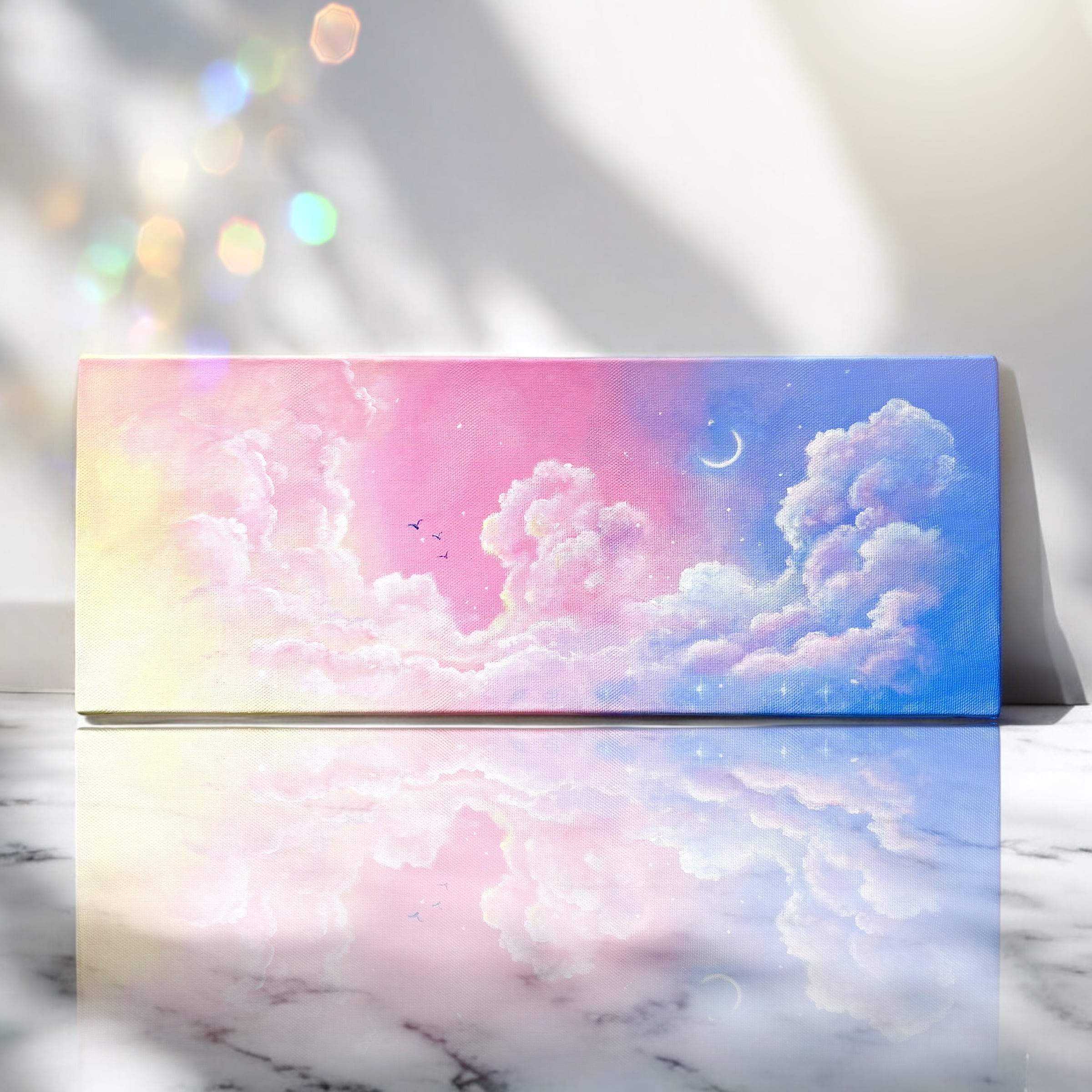 数ある作品の中から見つけて頂きありがとうございます˚✧₊⁎⁎⁺˳✧༚ 雲の上にある誰も知らない空˚✧₊⁎うっとりする美しいグラデーション・:*+. 月が優しく見守る中、鳥達が寝床へ帰っていくように飛んでいる 長細いキャンバスにはまるでそんな物語が隠れていそう✴︎想像はあなた次第✴︎ 棚の上に立て掛けるだけでも、壁に飾っても、空間に十分な存在感を放ち、たちまち見る人を夢の世界へと誘います .。.:*☆ price : ¥32000 size : 14cm × 36cm ×2.6cm
