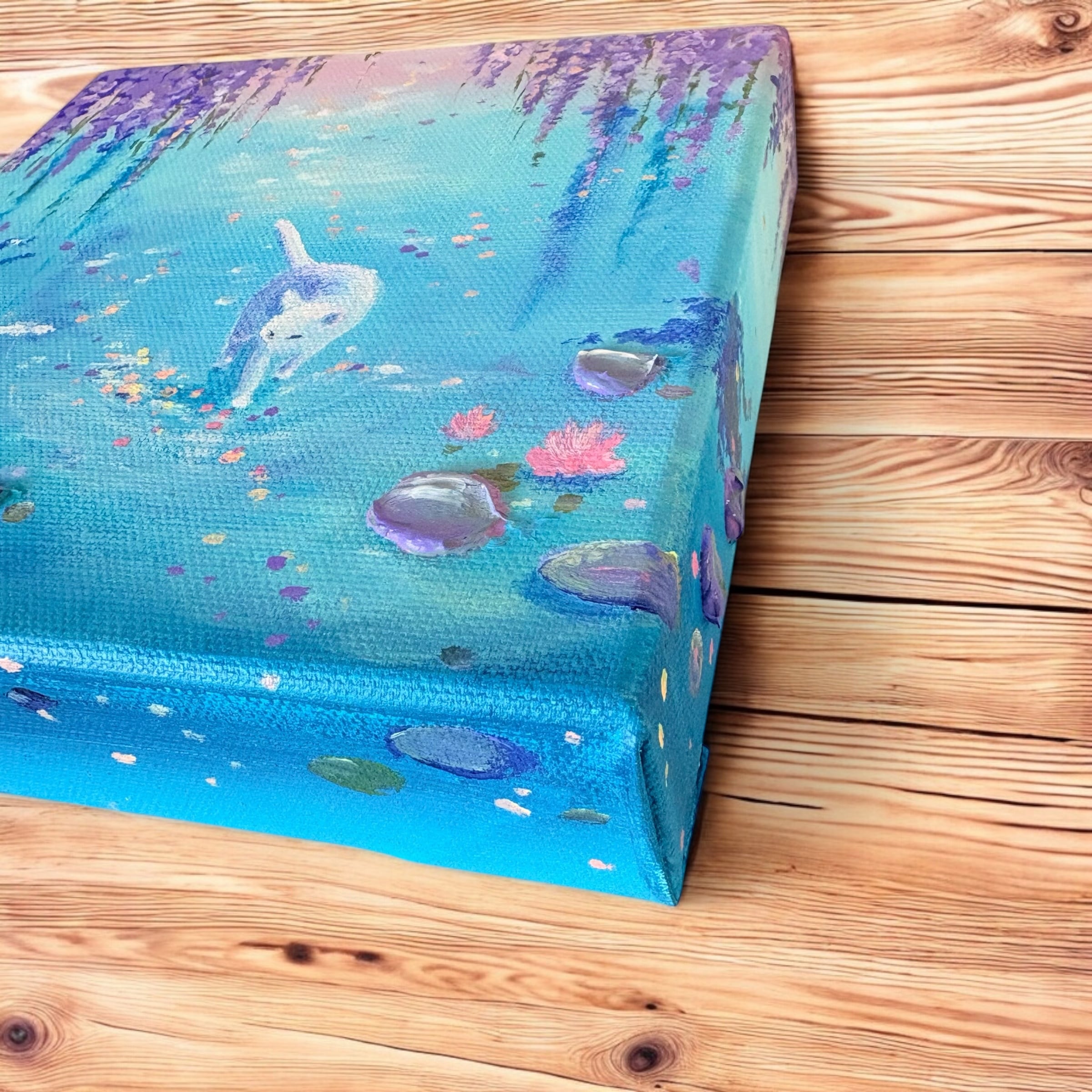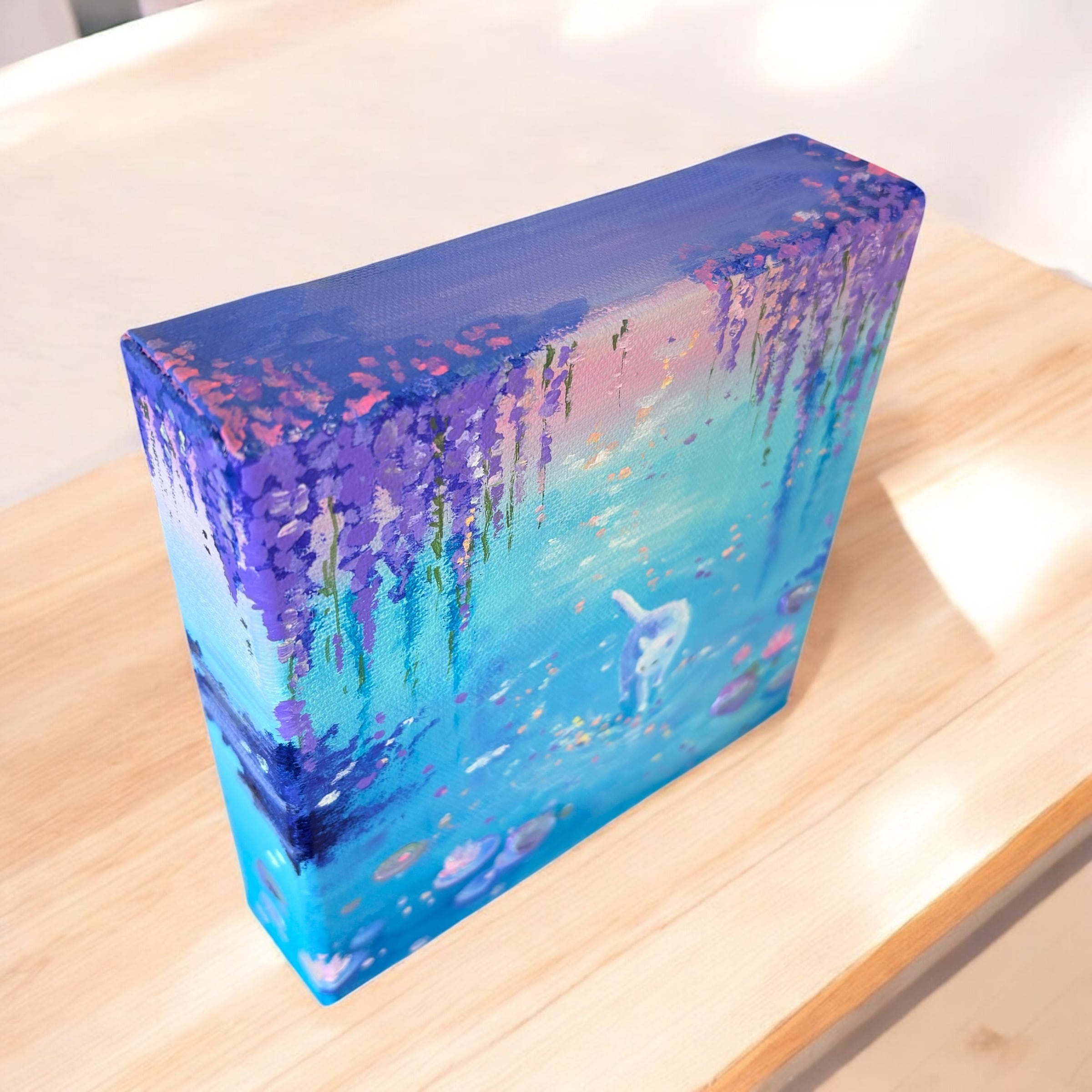 水面は陽光の反射や睡蓮の色を絶妙に混ぜ、真ん中の白猫は細かなタッチで引き立たせています。お部屋の雰囲気を一段と華やかに彩るこのアートは、ご自分用にも、また、猫好きな方への贈り物にもぴったりです˚✧₊⁎
