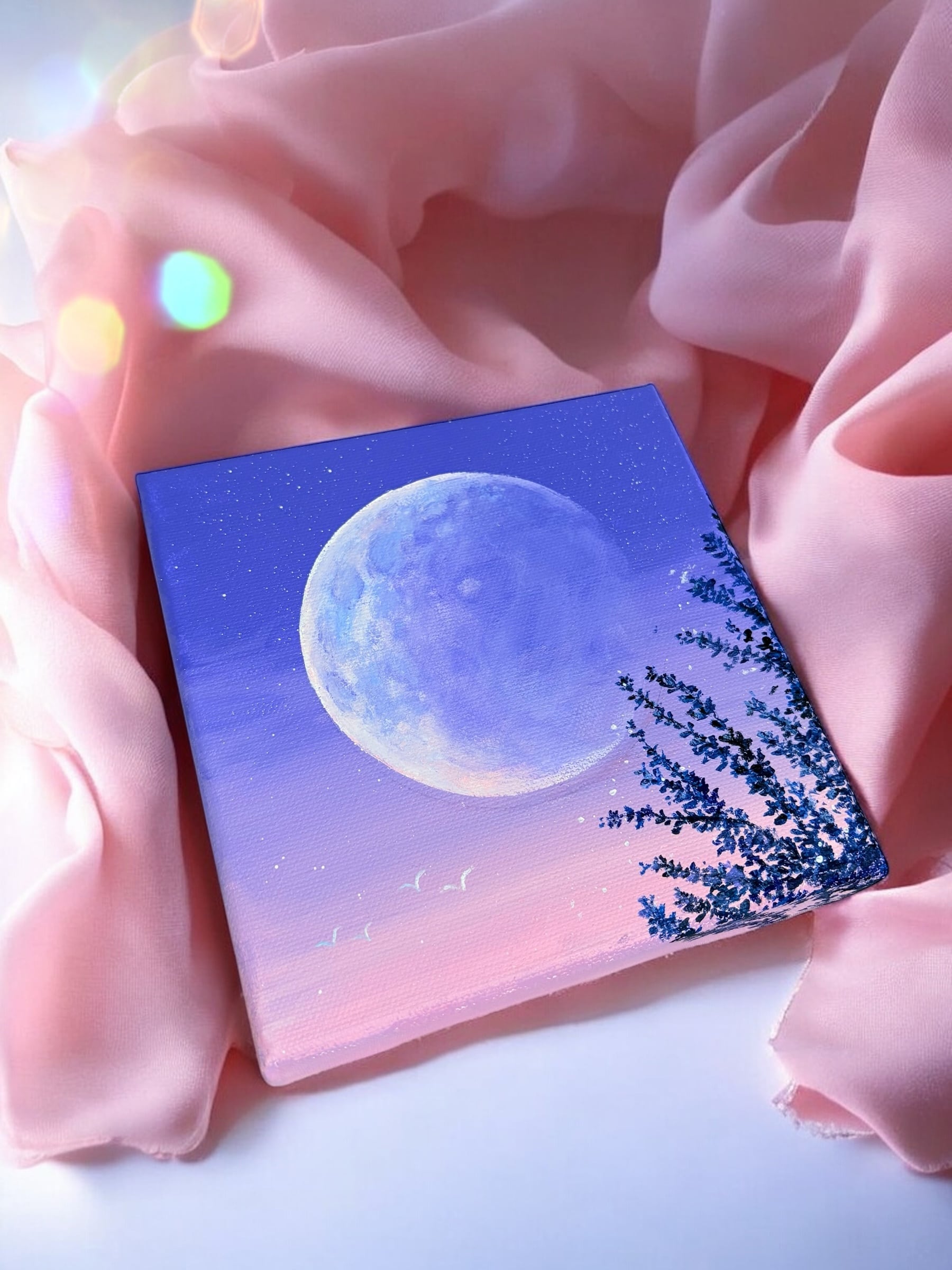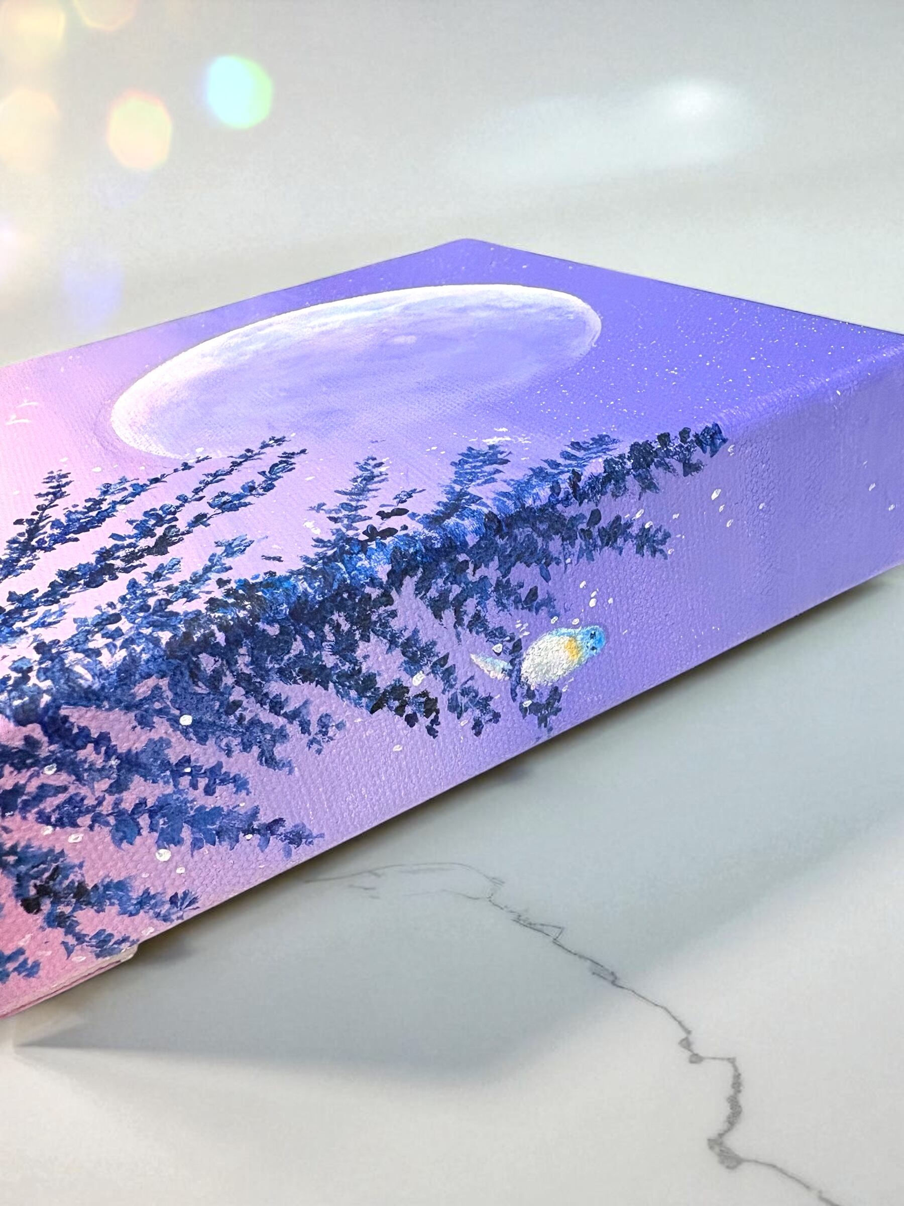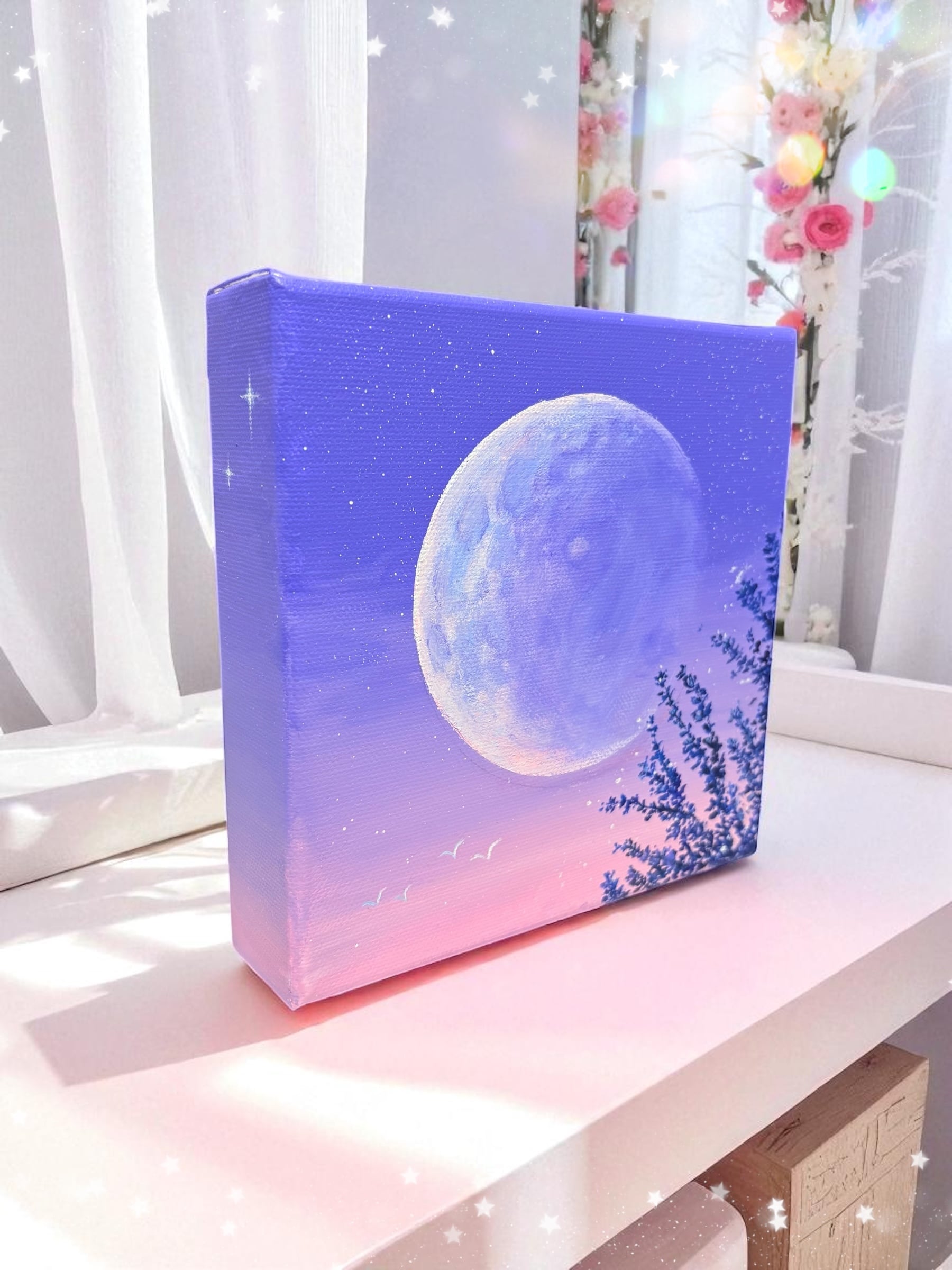 パープルとピンクの美しいグラデーションの空に、大きな白い半月˚✧₊側面には木の上で寛ぐ青い鳥✨厚めのキャンバスとパッと目を引くデザインが印象的なおしゃれアートになっております˚✧₊⁎